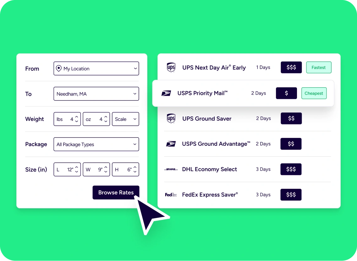 Our solutions team will identify exactly where you’re leaving money on the table — and show you how Rate shopper turns complex shipping decisions into automated savings. Whether you’re shipping 10K or 1M+ parcels annually, Rate shopper finds the best value rate in seconds—no manual work required.
